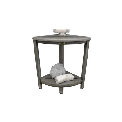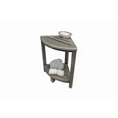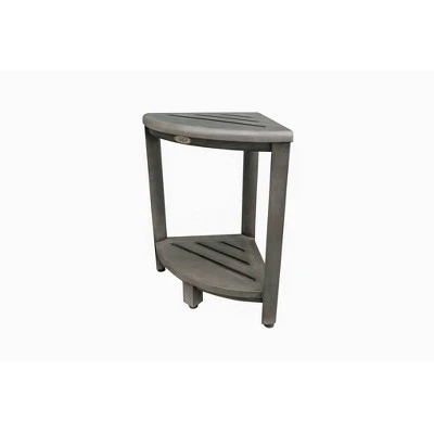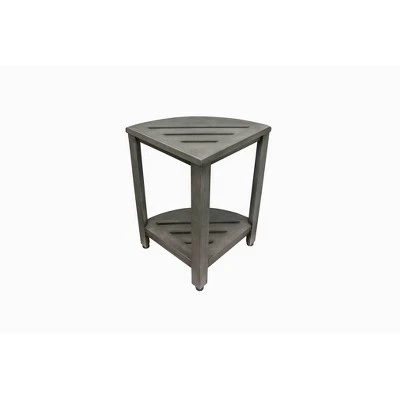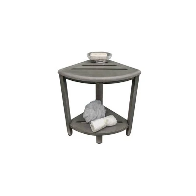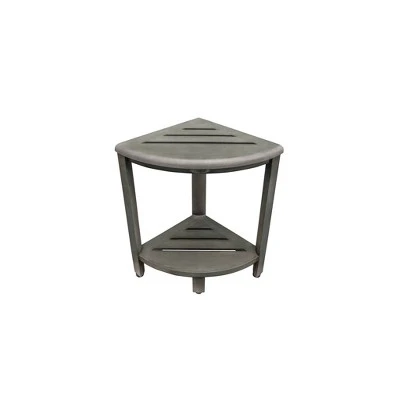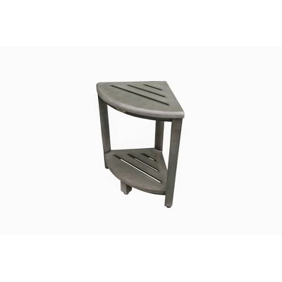 SnazzyCorner 12in Wide Teak Shower Bench with Shelf. With sides that each measure 12 inches long, with a height of 18 inches, it has a face that is 17 inches across. The included foot leveler pads allow independent adjustment of each leg to make minor adjustments for slight slopes in shower floors and to provide added non-slip stability. This piece features our Antique Gray finish, which is mostly gray, with the yellows and browns from the teak showing through.