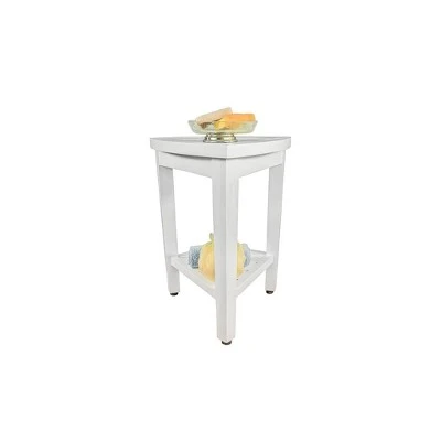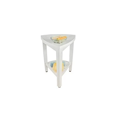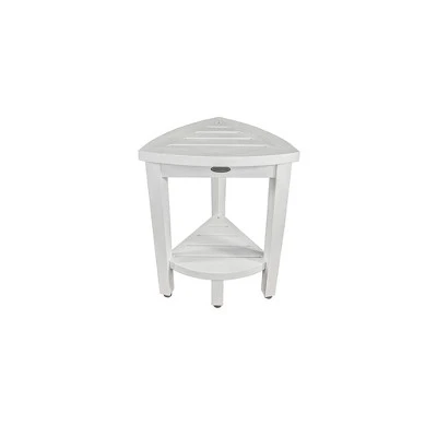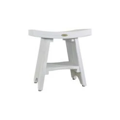 FlexiCorner 15in Wide Teak Shower Bench or Stool. With a height of 18 inches, a width of 15 inches, and a depth of 15 inches, this bathroom stool will work great anywhere in your home or outdoors. With a lower shelf and foot levelers this bench will remain sturdy even on uneven surfaces. This piece features our Antique White finish, which is mostly white, with the yellows and browns from the teak showing through.