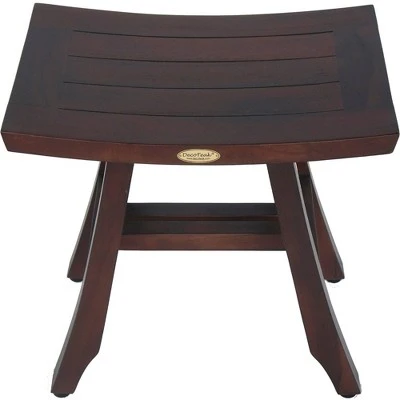 Satori 18in Wide Teak Shower Transfer Bench or Seat. Our patented (D717,053) Satori teak shower bench has a compact design measuring 18 inches in length, 14 inches in depth and 18 inches in height. The included foot leveler pads allow independent adjustment of each leg to make minor adjustments for slight slopes in shower floors and to provide added non-slip stability. In a beautiful woodland brown, this bathroom seat will look great in any home.