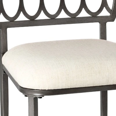 - Art deco-inspired metal vanity stool finished in Pewter with Cream upholstery on the seat