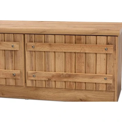 Give your home a cozy and welcoming atmosphere with the charming Oswald storage bench. Made in Malaysia, the Oswald is comprised of sturdy wood finished in a stunning natural oak brown hue. Four shelves provide storage for shoes, blankets, and more. Requiring assembly, the Oswald is fitted with paneled wood doors that lend a warm farmhouse aesthetic. Easily organize busy entryways with the stunning Oswald storage bench.