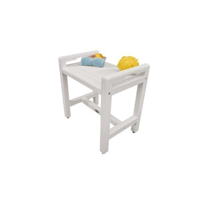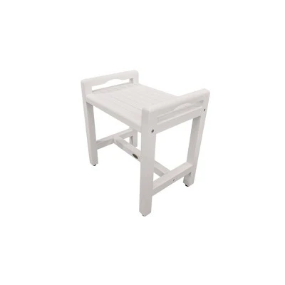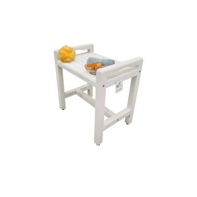 Eleganto 20in Wide Teak Shower Bench with Handles. Measuring 20 inches in length, 14 inches in depth, and 21 inches in height, this bathroom bench with LiftAide arms has a seat that is 18 inches tall, and has a lower Crossbar for support. The included foot leveler pads allow independent adjustment of each leg to make minor adjustments for slight slopes in shower floors and to provide added non-slip stability.