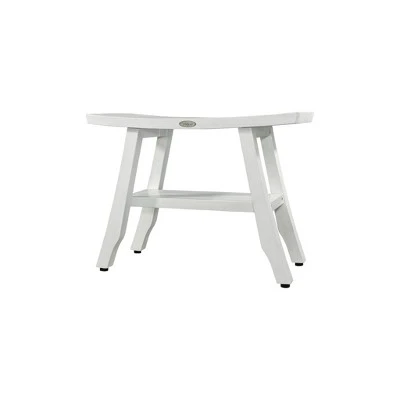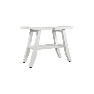 Satori 24in Wide Teak Shower Stool for Shaving Legs. With a height of 18 inches, a width of 24 inches and a depth of 14 inches, this bathroom seat will work anywhere in your home or outdoors. With a lower shelf and foot levelers this bench will remain sturdy even on uneven surfaces. This piece features our Antique White finish, which is mostly white, with the yellows and browns from the teak showing through.