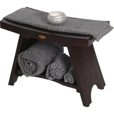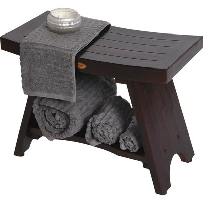 Serenity 24in Wide Teak Shower Bench with Shelf. With dimensions of 24 inches in length, 14 inches in depth, and 19 inches in height. This bathroom stool also has foot leveler pads that allow adjustment of each leg to account for uneven floors and to provide added non-slip stability. Adorned in a rich woodland brown, the deep tones are brought forth in this amazing finish.