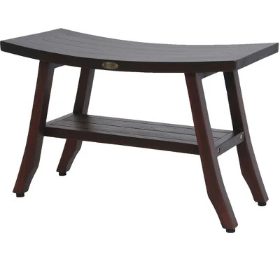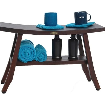 Satori 28in Wide Teak Wood Shower Bench with Shelf. With dimensions of 28 inches in length, 14 inches in depth and 18 inches in height. This shower stool also has a shelf and foot leveler pads that allow adjustment of each leg to account for uneven floors and to provide added non-slip stability. Adorned in a rich woodland brown, the deep tones are brought forth in this amazing finish.
