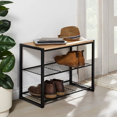 Keep shoes off the floor and the entryway uncluttered with the 3-Tier Entry Bench in Black Metal with Natural Wood from Brightroom™. This entry bench is a great pick for keeping any space organized, but it’s particularly convenient for a closet, entryway or mudroom. The two shelves are perfectly sized to each hold a few pairs of shoes, or combine with organizers for handy shelf storage. This metal entry bench includes a natural wood top for placing a hat, keys and more, and the black finish easily coordinates with any décor theme.