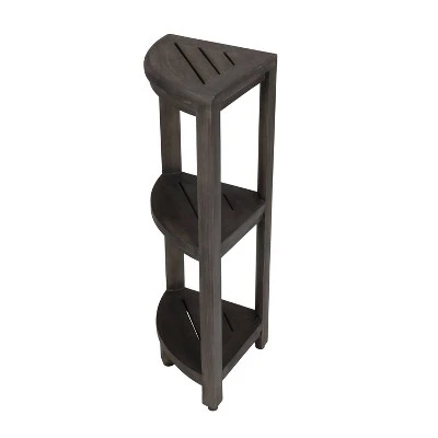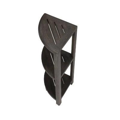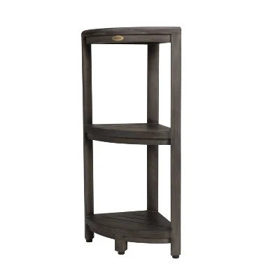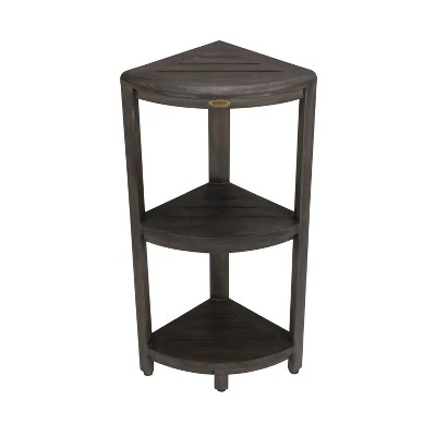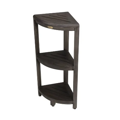 SnazzyCorner 32in Tall Teak Shower Shelf for Corners. With sides that each measure 12 inches long, this 3 tier bathroom organizer measures 32 inches tall, and has a face that is 17 inches across. The included foot leveler pads allow independent adjustment of each leg to make minor adjustments for slight slopes in shower floors and to provide added non-slip stability. This piece features our Antique Gray finish, which is mostly gray, with the yellows and browns from the teak showing through.