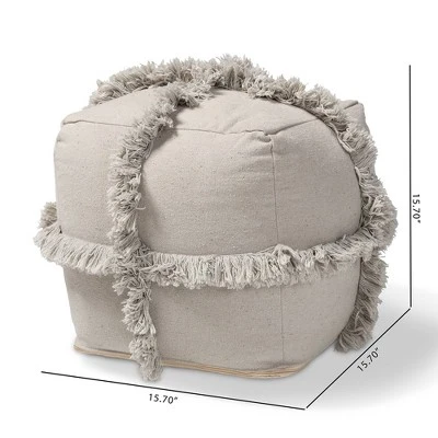 Add a cozy, bohemian touch to any space with the Alfro pouf. Handwoven from cotton, the Alfro features an understated gray hue. A criss-cross overlay of fringe lends a touch of texture. This versatile piece can be used as a seat, footstool, or casual coffee table. Made in India.