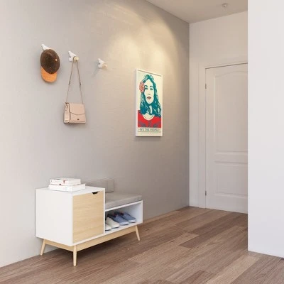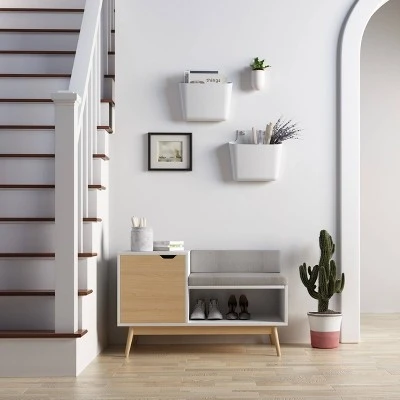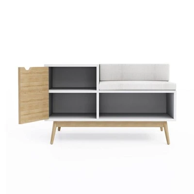 Clean line in design and mid-century in aesthetic, the Blythe Sectional Bench is a great welcoming piece to an entryway or any place in the home. Compact and modest, the streamlined design echoes retro with a modern twist, with plenty of storage space under the seat or hidden behind the door. The satin paint finish is complemented by the natural wood dowel legs, keeping a true retro yet urban feel.