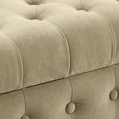 Revamp your home in an elegant way with this luxurious looking storage bench settee. Made up of using plywood and wood with the beige colored soft premium velvet upholstery, this designer bench settee features padded seat and slightly flared arms with all over button tufted detailing. It has wooden tapered legs in a dark walnut brown finish that provide good support to the complete structure. An easy hinged top offers ample storage that is suitable for hiding spare throws, pillows, extra books, magazines or toys with extra seating space in a living room.