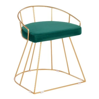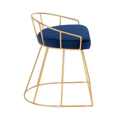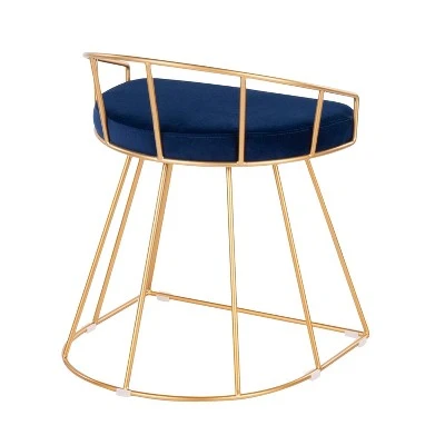 Opulent and confidently contemporary – that’s the Canary Vanity Stool by LumiSource. Features a captivating cage-like gold tone metal base with footrest, a subtle curved backrest, and an elegant upholstered seat available in various modern colors. Can be used asa vanity seat, extra seating in your living room, or even a glam style desk chair. Definitely a bold touch of fancy for your seating needs.