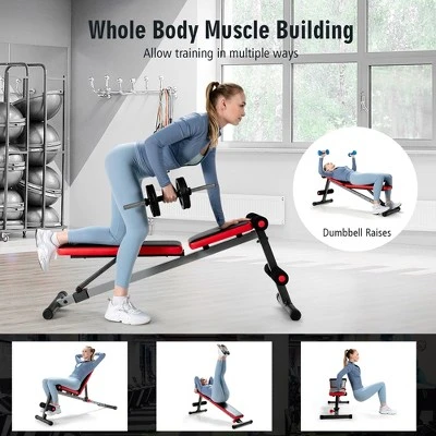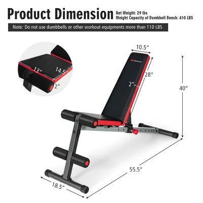 This multi-function weight bench will be a perfect exercise equipment of your home gym and bring your daily fitness more convenience.. The entire bench is constructed with super sturdy steel frame to ensure your safety in training all the time. By adjusting the backrest angle to the desired position within 9 levels, you can exercise in inclined, flat and dropped way for different workout intensities and postures. The 2” multi-layer cushion will improve your fitness experience with the breathable PU leather and high-density foam. The bench features an ideal size which is suitable for most people to use it for fat loss, body-shaping, muscle building and so on. You can do bench press, sit-up, dumbbell lift and other exercises just like that in the gym. . Specification: Color: Black and Red. Material: Steel, PVC Foam, PU. Overall Dimension: 55.5” x 18.5” x 40” (L x W x H) . Size of Backrest: 28” x 10.5” x 2” (L x W x H) . Size of Seat: 14.5” x 13” x 2” (L x W x H) . Net Weight: 29 lbs. Weight Capacity: 410 lbs. Note: Please do not use dumbbells or other workout equipments more than 110 lbs. . Package includes: . 1 x Weight Bench. 1 x User Manual.