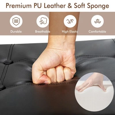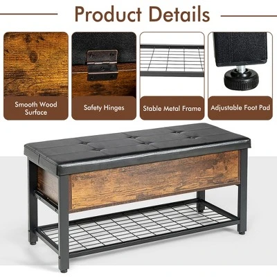 Our multifunctional storage bench is a perfect choice for your entryway, hallway, bedroom and living room. . With shoe shelf, storage compartment and soft seat, our bench can satisfy your different needs. Made of high-quality PB panels and strong steel frame, it is durable and stable enough to withstand a weight up to 330 lbs. Besides, adjustable feet ensures extra sturdiness. Rounded edges protect you and your family from impacts and scratches. PU leather covered cushion with soft sponge enables you to sit with comfort. What’s more, it can not only serve as a shoe rack, but is also used as a bedside stool and a storage box, satisfying your different needs. Furthermore, with simple style and classic colors, it is suitable for your bedroom, living room and entryway. It also comes with detailed instruction and necessary accessories, which helps you to assemble it easily and quickly. . Specification: Color: Brown+ Black. Material: PU Leather+ PB+ Steel+ Sponge. Overall Dimension: 40” x 16” x 20” (L x W x H) . Storage Size: 34” x 13.5” x 6.5” (L x W x H) . Net Weight: 37.5 lbs. Weight Capacity of the Top: 330 lbs. Load Capacity of Storage Space: 50 lbs. Load Capacity of Storage Shelf: 20 lbs. . Package includes:. 1 x Storage Shoe Bench. 1 x Instruction.