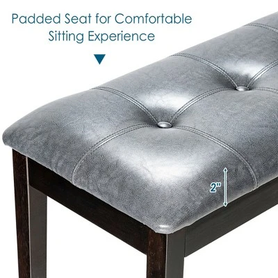 Are you finding a practical bench for your house? The frame of bench is made of solid wood which ensures the sturdiness and durability. And padded with highly resilient and soft sponge, it is comfortable for you to sit on it for eating or changing shoes. There are 4 pads at the bottom of feet to prevent slipping and scratching of floor. Designed in rustic and concise style, this bench will be a perfect decoration for any style of decoration. It not only can be a dining bench but also can be placed in bedroom or hallway for changing shoes or resting. Because of its smooth PU surface, it is waterproof so that it is easy for you to keep the whole product clean and tidy. After receiving the bench, it is convenient to install together with instructions. Specification: Color: Grey. Materials: PU + Rubber Wood. Dimension of Bench: 45.5” x 15” x 19” (L x W x H). Net Weight: 20 lbs. Weight Capacity of Bench: 250 lbs. Package include:. 1 x Bench. 1 x Instructions.