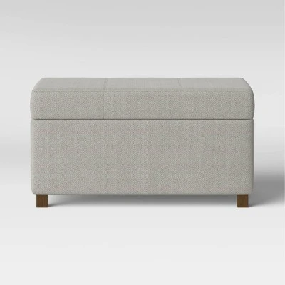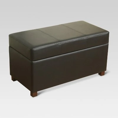 Mix sophisticated style and convenience with the Essex Basic Storage Bench from Threshold™. Perfect for supporting your feet while you read, watching television or just sitting back and relaxing, this ottoman combines a classic design with modern flair. The faux leather cover gives a timeless touch that adds a functional yet stylish accent to any room. The hinged seat cushion allows for quick and easy storage, perfect for housing blankets and pillows when not in use.