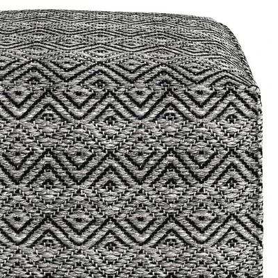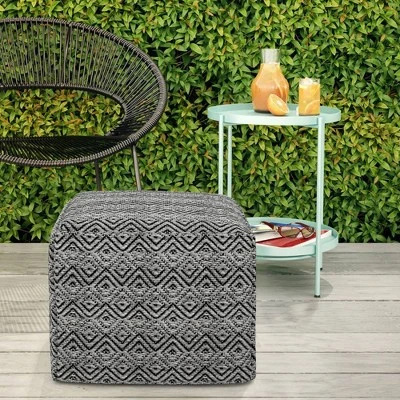 Add panache and color to your outdoor or indoor living space with Flora Square Woven Outdoor/ Indoor Pouf. This pouf is perfect for use as a footstool or as extra seating. Featuring a gray and black pattern this square-shaped pouf boasts durable and easy-care woven polyester that is water and UV resistant. This versatile pouf is sure to enhance the style of your decor.