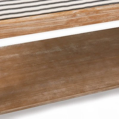 After a long day, you’ll enjoy the cushioned comfort of this cozy upholstered bench. Whether it’s an entryway seat to remove your shoes or a relaxing foot stool in the living room, this bench is sure to become a focal point with its comforting cottage style. The lower shelf adds extra storage space right where you need it. The distressed finish and charming turned wood legs soften the look of your furnishings. Black and white striped fabric on the padded seat adds a modern farmhouse style that is long lasting and easy to maintain for even the busiest families.