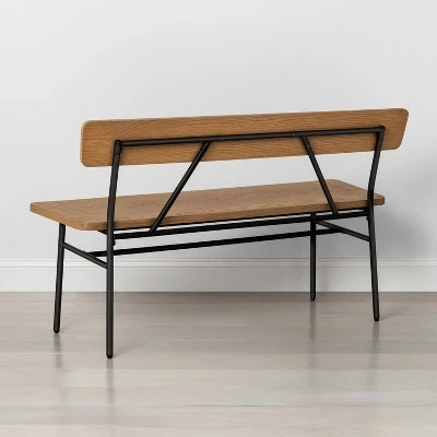 - Rectangular wood and metal bench with clean lines offers a pop of textural contrast