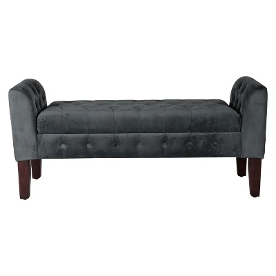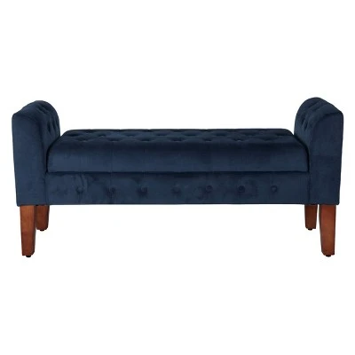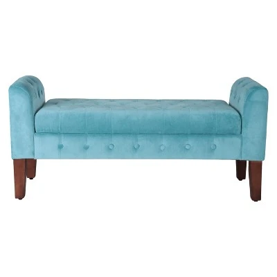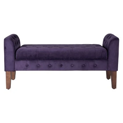 This elegant storage settee features all over button tufting for a luxurious look and feel. Upholstered in a soft and durable premium velvet fabric, this decorative bench has wood legs in a range of rich finishes. The hinged seat opens to reveal storage suitable for spare throws or pillows, books, magazines or toys. Use it as an end of bed bench, as an entryway bench or as extra seating and storage in a living room. This velvet bench is available in many rich colors and is part of a broader collection including accent chairs, tufted storage ottomans to match in the same great velvet fabric. Easy to assemble and maintain.