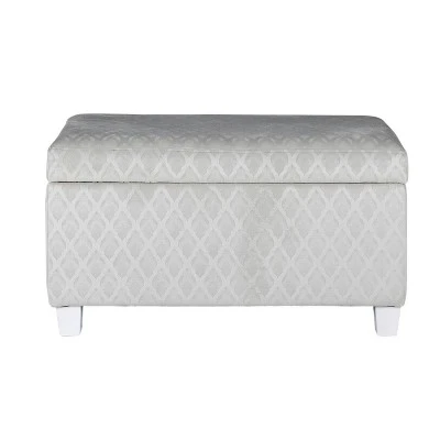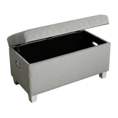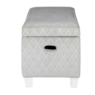 This kids’ storage bench can corral toys, blankets or books while providing kid-sized seating for friends. Covered in light gray geometric pattern, this kids’ bench has a velvety look and feel that is on trend and durable. With a hinged lid top, this kids’ bench provides child-friendly storage that is easy for small hands to open and close. Use in the play room or as a bedroom storage bench to keep the toy collection manageable. Featuring cut out side handles and wood legs in a white finish. Easy to assemble and maintain.