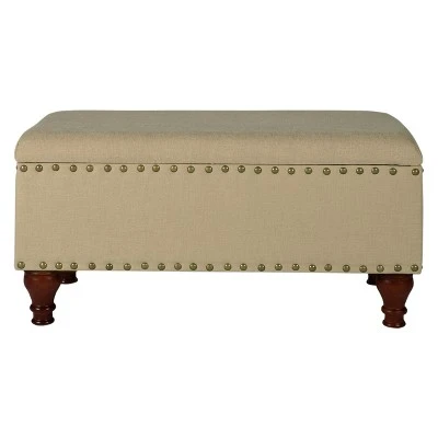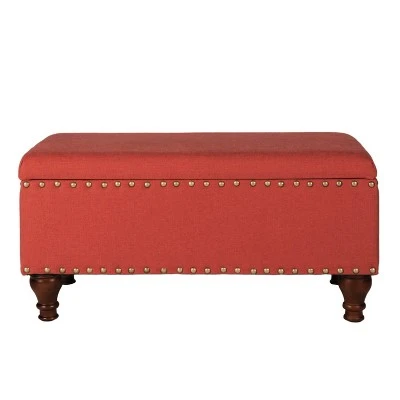 Add style and storage to any room in the home with this classic rectangle storage bench. Featuring timeless nailhead trim and spiral wood legs in a light cherry finish, this bench is a multi-tasker. Use it to provide extra seating or extend hospitality as a coffee table ottoman. Allow it to hold pillows or blankets as an end of bed bench. Strategically position it in an entryway or mudroom to contain outdoor accessories or shoes. Undeniably a premium addition to any home at a reasonable price, make this the next accent furniture investment. Easy to assemble and maintain.