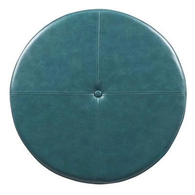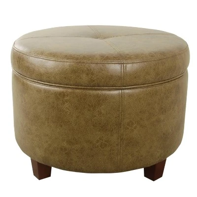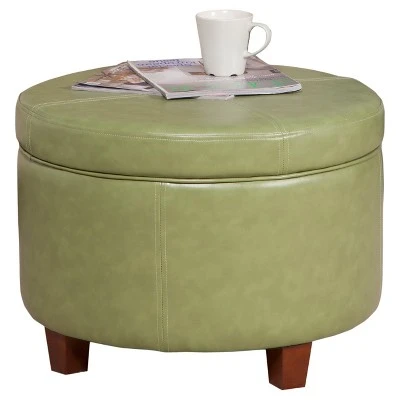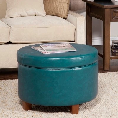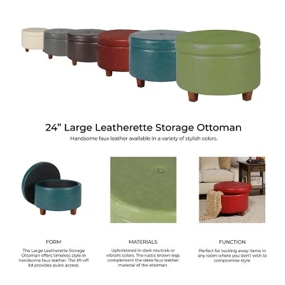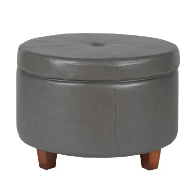 Our large round storage ottoman offers timeless style in handsome faux leather. Use it in your living room or family room to contain controllers, remotes or toys or place it in your bedroom to store extra pillows or blankets. One faux leather ottoman offers stylish seating and storage ─ two paired together doubles the impact wherever you need it most. Upholstered in vibrant colors with wood legs in a rustic brown finish, our round ottoman has a lift-off lid for quick access to storage within. Available in a range of neutral and on-trend colors; easy to assemble and maintain.