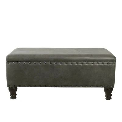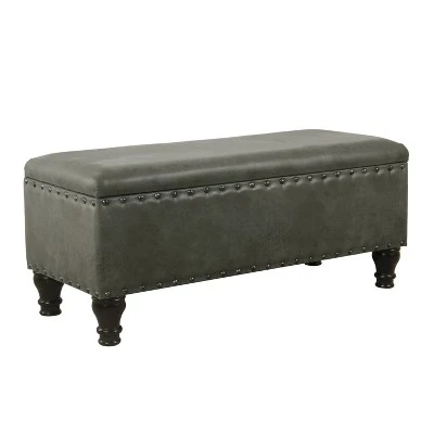 Add style and storage to any room in your home with our classic long storage bench. Featuring timeless nailhead trim and ebony finished wood legs, this multifunctional storage bench can provide seating and double as a coffee table, serve as a bedroom bench or as an entryway bench with storage. The classic faux leather easily blends with many different styles and colors. If you’re looking for a premium addition to your home at a reasonable price, make this your next accent furniture investment. Easy to assemble and maintain.