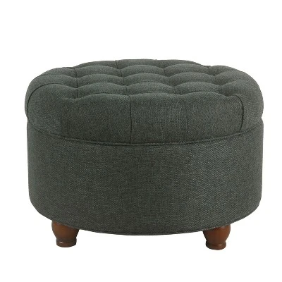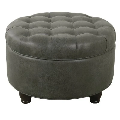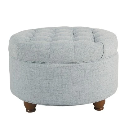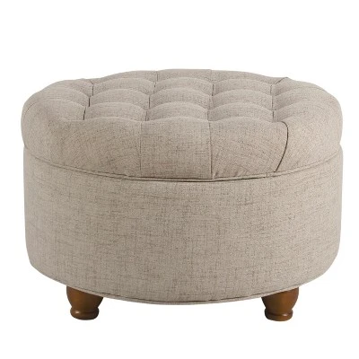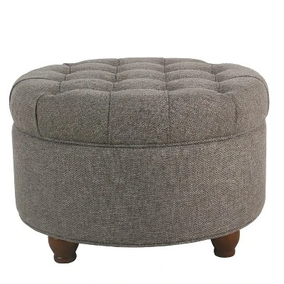 This large round storage ottoman offers timeless style in handsome faux leather. Use it in a living room or family room to contain controllers, remotes or toys or place it in the bedroom to store extra pillows or blankets. One ottoman offers stylish seating and storage ─ two paired together doubles the impact wherever it’s needed most. This round ottoman has a tufted lift-off lid for quick access to storage and tapered wood legs. Available in a range of neutral colors and fabrics; easy to assemble and maintain.