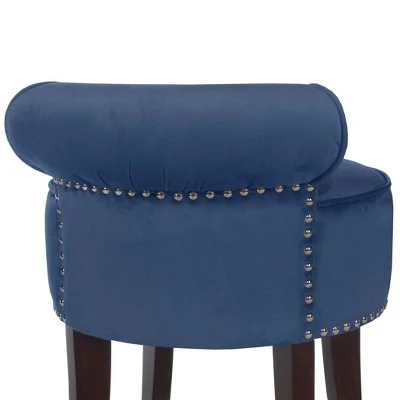 Modern with a touch of class, the Lena vanity stool features an amply padded seat with an ultra-low sleigh decorative back. Its saber legs are made from rubberwood with a Dark Espresso finish. The dazzling blue upholstery is soft yet firm and has a silver nail head trim. This attractive stool nicely doubles as an ottoman or dressing seat. Assembly required.