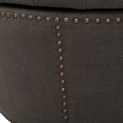 Complete your home decor with the style and functionality of the Roarke Storage Ottoman. Featuring a tufted top, this round storage ottoman is upholstered in a polyester and linen fabric, for a rich transitional look. The brass nail head trim around the base adds an elegant touch, while the ample storage space for your blankets and other essential items. Seamlessly blending functionality with beautiful style, this storage ottoman is the perfect addition to your living room or bedroom decor. No assembly required. Max weight capacity: 300lbs.