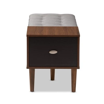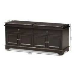 Dual-purposed and versatile, this bench is a great addition to your foyer, mudroom, utility room or bedroom. Featuring retro modern style, the Merrick is constructed of engineered wood and finished in two-tone finishing, oak and espresso . The fabric upholstered cushion provides a comfortable seating area and ample storage space when it is lifted open. The drawer on the right provides extra storage space for your hats, keys, gloves and scarfs. Silver hardware is in use to add modern tone. Shapely legs featuring mid-century style are constructed of solid rubberwood, supporting the seating storage bench. Made in Malaysia, the Merrick requires assembly. Dimensions: 17.36″ High x 46.8″ Wide x 15.6″ Deep; Drawer: 7.63″ High x 12.2″ Wide x 13.18″ Deep; Shelves: 7.7″ High x 15.13″ Wide x 14.4″ Deep; Cushions: 1.97″ High x 15.13″ Wide x 14.4″ Deep