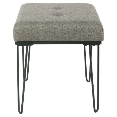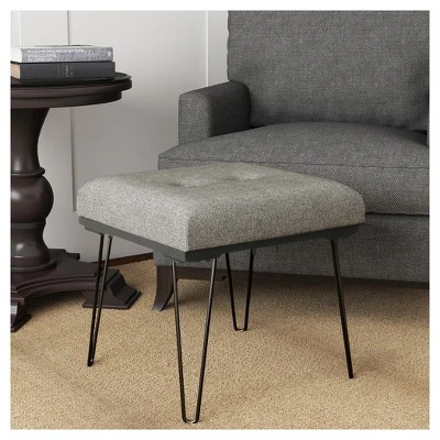 Modernize your space in any room with this mid-century style ottoman with metal hairpin legs and button tufting. Pair two at the end of a bed or around the living room for extra seating. This button tufted stool is perfect for placing next to the sofa and propping up your feet after a long day. The cushion features 4 inches of medium firm padding for extra comfort. Maximum weight capacity is 250 pounds. No assembly required. 19Wx18″Dx18.5″H.