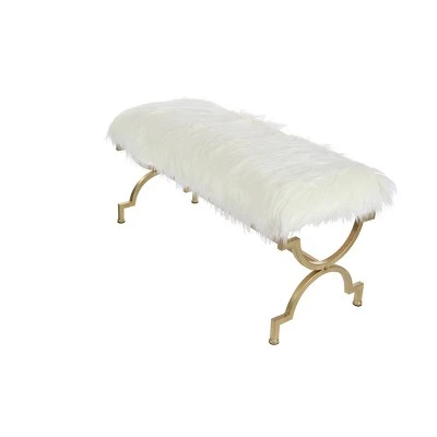- This faux fur bench cushion is furnished with sculpted hourglass-shaped metal legs with a bar support