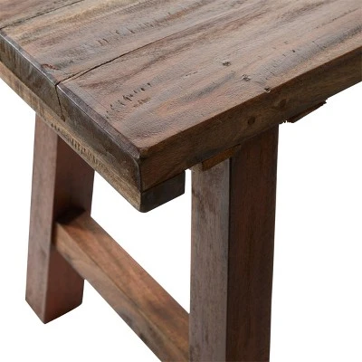 This wooden bench seat has a simple brown design that can be amplified by cushion pillows and woven fabric. So take a load off and relax on this decorative bench. A small piece of furniture that make a big difference to give your home an instance refresh. Designed with rubber stoppers at the base that prevent scratching furniture and table tops, as well as sliding around. This item comes shipped in one carton. Slightly fluted A-shaped legs. Due to the nature of this one of kind item, no two will be alike, there will be slight differences in shape, size, and color. Suitable for indoor use only. 400 lbs. max weight limit. Made in Indonesia. Industrial theme