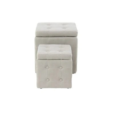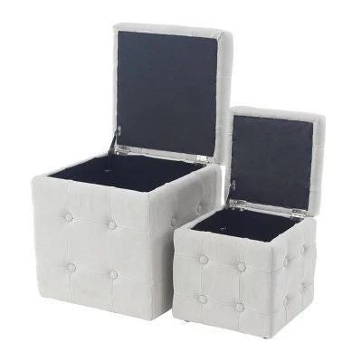 - Features 2 stools in varying sizes with lift top lids and deep storage compartments