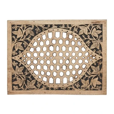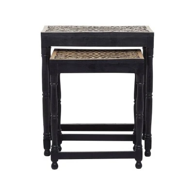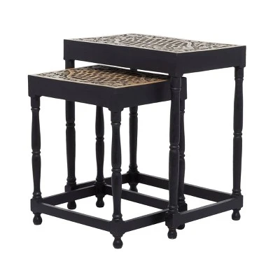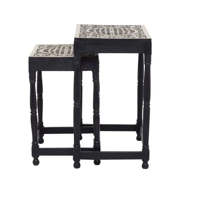 Add an enchanting touch of carved wooden pieces into your living room area as you place this table and stool pairing with light toned walls and nude colored furniture. A compact friendly table providing you with additional storage space any where in your home. Useful and elegant, side tables are more than just a place to throw your mail or place a lamp. Designed with thin rubber stoppers at the base that prevent scratching furniture and table tops, as well as sliding around. This item is shipped in one carton. Wood is cut and intricately carved to form an elegant set of accent tables and chairs. Due to the handmade nature of this item, no two will be alike, there will be slight differences in shape, size, and color. Suitable for indoor use. Made in India. This item comes as a set of 2. Eclectic style. Maximum weight limit is 250 lbs.