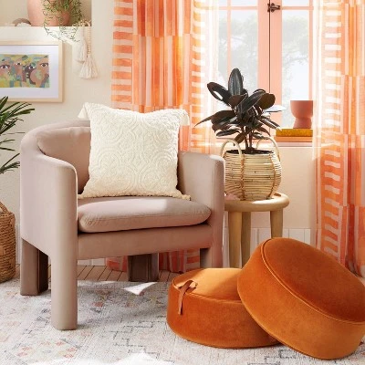 Bring eclectic charm to your living room decor with the Olivia Round Pouf from Opalhouse™ designed with Jungalow™. Draped in a soft fabric upholstery, this decorative round pouf is generously filled with beads and foam to offer you a cozy spot to perch. This upholstered pouf features a two-tier design with a loop in one piece and a tie cord attached to the other that can be untied to create two comfy footrests or low-floor poufs. In a bright solid hue, it’s sure to elevate your boho-inspired decor, while adding functionality to your space.