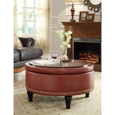 This Augusta Storage Ottoman offers your home with much more than just an attractive storage solution. Currently available in a host of classic colors, this seating, serving, and storage solution boasts a plethora of features. Durably constructed with easy care bonded leather, this circular ottoman will withstand the test of time while still retaining its distinguished demeanor. This classic and timeless furnishing features brass color nail head trim and deep espresso stained turned legs that provide for an air of sophistication. Intelligently outfitted with a stained wood interior storage tray, this outstanding ottoman will live in the center of your living room or den. Boasting a spacious interior area and a reversible lid, this smart storage and seating solution works perfectly as extra seating for unexpected guests and the perfect place to house extra items. A winner on so many levels, the Augusta Storage Ottoman will provide your home style, storage and seating.
