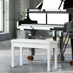 Costway Solid Wood PU Leather Piano Bench Padded Double Duet Keyboard Seat Storage White