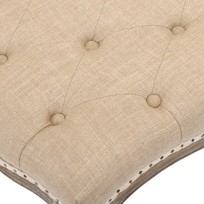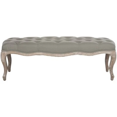 Exuding Country French charm, the Ramsey bench recreates the look of a family heirloom with beautifully carved pickled oak frame and timeless cabriole legs. Covered in wheat beige linen with flat black nail head detailing on upholstery tape, Ramsey makes a welcoming statement in an entry hall, and inviting one in bedroom or living room.