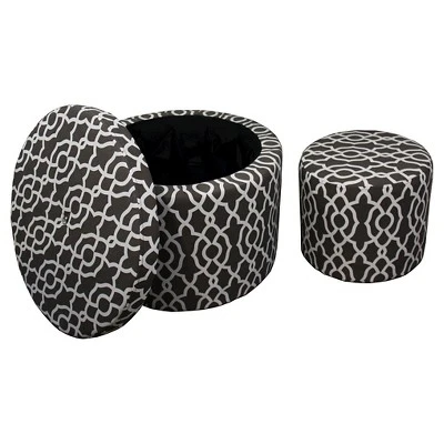 Ore International’s Round Geometric Storage Ottoman Seating. This ottoman features a 100% cotton fabric cover and high density foam filling that makes it comfortable and lightweight. Storage Bin has extra pocket surround storage for extra organization when needed. Features comfortable padding with plush upholstery with a single crystal-like button in the center over sturdy frame. Its sleek geometric pattern adds an eye catching accent to any room.