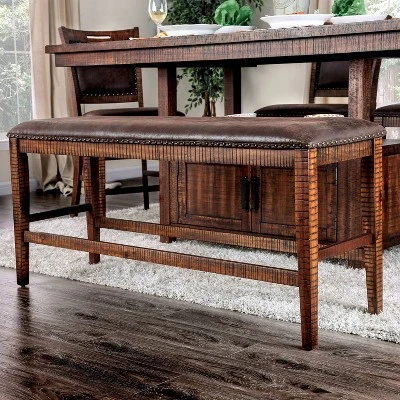 Enjoy the plush comfort and eye-catching style of this rustic counter height dining bench. Crafted with solid wood and wood veneer, it provides a supportive foundation for cozy, casual dining. Its seat is thickly padded and upholstered in soft Faux leather material, accented with nailhead trim, for an exceptional level of comfort.
