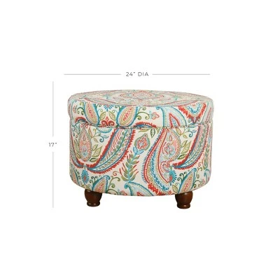 This classic round ottoman offered in fun designs creates a striking impact. The modern patterns in a textured flax blend is complemented by wood legs. This storage ottoman will add functional style to any space. Use it to store extra pillows or blankets in a bedroom, hide toys or controllers in the family room, or conceal accessories in the entryway. Pair two ottomans together and double the impact. The lift-off lid enables easy access to storage within. No assembly required; spot clean as needed.
