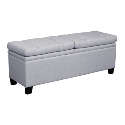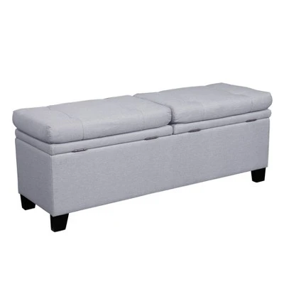 Whether you’re making the most out of small space living or just want to add more functionality to your furnishings, this smartly-styled upholstered storage bench is the answer. A split-cushioned seat incorporates button tufting and stitching for plush, inviting comfort on the top. Lift the edge of either seat and smooth gas-lift hinges will reveal a roomy storage space – perfect for linens, shoes, books, and other personal belongings. Two distinct storage compartments – one beneath each seat – double your organization options and make this bench a must-have.