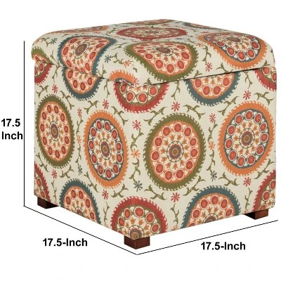 As versatile as it is stylish, this ottoman will make a perfect place for seating space or kicking up your feet in style. With wooden framework, this multicolored suzani patterned fabric upholstered ottoman has lift top lid opening, providing storage space to store linens, drapes, blankets, extra pillows, controllers, magazines or books. Designed in square shape, this classic ottoman has block feet that provide it balancing support. Fully upholstered in fabric, this can be used for seating purposes, serving stool or to rest feet when tired.