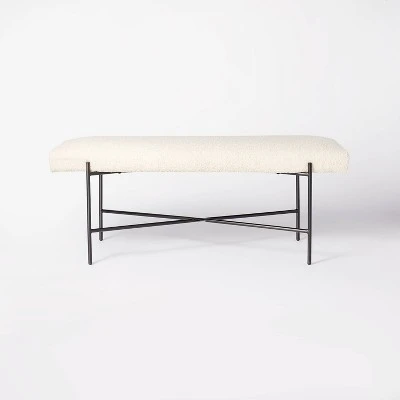 Give your home a classic sense of style with the Clarkston Metal Base Upholstered Bench Cream Boucle from Thresholdâ„¢ designed with Studio McGee. The cream colored boucle design of this bench makes it a perfect understated yet beautiful addition to your space. The textured upholstery adds subtle texture, and the black metal legs create a timeless look that uplifts the sophistication of your space. The high contrast design elements add a touch of boldness, while still being delicate enough to highlight other furniture or accent decor. The neutral colors and textures work perfectly with a variety of design themes and elements. This bench works well as a centerpiece in a living room or an accent piece in a bed space.