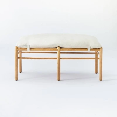 Lend a sophisticated touch to your entryway or living area with this Emery Wood and Upholstered Bench with Straps from Threshold™ designed with Studio McGee. Made from wood, this natural bench has cream cushions for comfort and an all-around sophisticated look. Perfect to seat up to two people, this upholstered bench comes with straps to make it easy to remove the cushions when not needed.