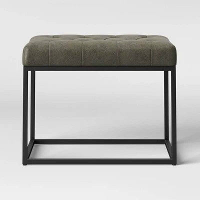 Add extra seating to your living room, TV room or den with the sleek and stylish Trubeck Faux-Leather Tufted Metal Base Ottoman from Project 62™. Featuring a foam-filled tufted seat and a sleek, open powder-coated metal frame, this upholstered ottoman offers you or your guests a luxurious seating experience. The tufted faux-leather seat adds a little texture to your living space, while the solid metal base in a gold tone provides a durable and elegant construction. From acting as a spare seat for guests to doubling as a handy footrest, this tufted faux-leather ottoman will make a stylish addition to your space.