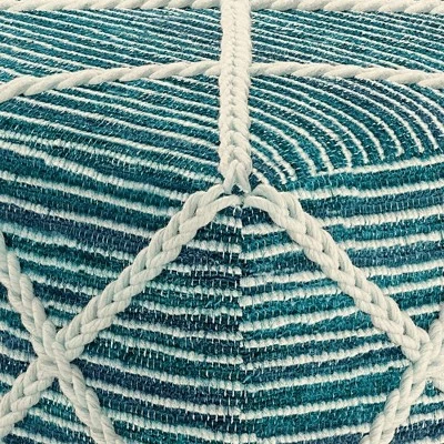 - Handcrafted with Wool and Cotton in a Woven Teal and Natural pattern